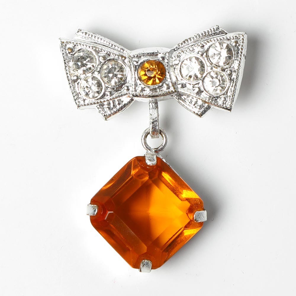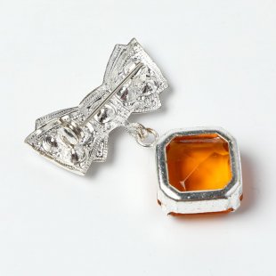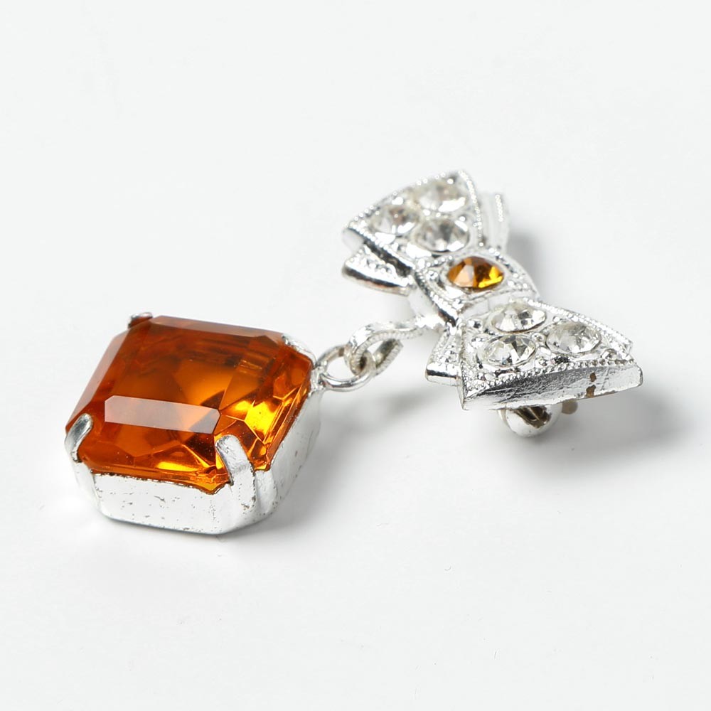 こちらはチェコスロヴァキア時代のヴィンテージ・ブローチ。デッドストックで入手した未使用品です。金属プレートのリボンにはクリア・クリスタルカットガラスがあしらわれ、下には大きなオレンジの四角いガラス石が吊られています。ガラス石は大きめですのでゆらゆらキラキラ、深い色合いの輝きがあります。レトロな雰囲気のキュートな懐かしいヴィンテージ・ブローチです。状態も素晴らしいものです。
