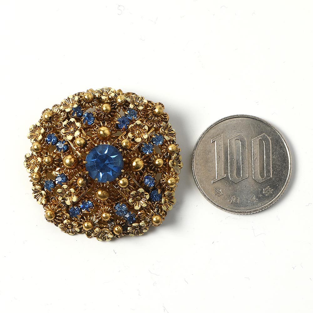 こちらはチェコスロヴァキア時代のヴィンテージブローチです。沢山の小さなお花が台座一杯に散りばめられた大変繊細な雰囲気のブローチです。またブルーのカットガラスがあしらわれ、シックで上品な雰囲気のブローチです。大体1930年代から20世紀中頃のものと思います。台座のゴールドはアンティーク・ゴールド。少し彩度を抑えたお色でアンティークや大人っぽい装いによく合うと思います。ピンの状態も含めて状態も良いものです。