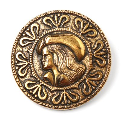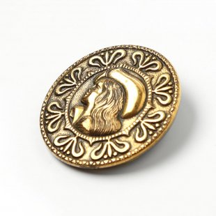 こちらはチェコの黒ガラスのブローチ。チェコの古い黒ガラスはその濃さが太陽をかざしてみても光を通さないほどの色の濃さがあり、こちらでもコレクターのカテゴリーをなしています。今では使用できない特別な薬品を使用して製造していたため、今ではもう作れないものだそう。こちらもその貴重な黒ガラスです。こちらはその表面に金色の塗装が施されています。正面には三銃士のような、大きな帽子をかぶった長髪の少年の横顔。チェコらしいデザインの一つといえますが、日本ではなかなかお目にかからない変わったデザインです。金色の装飾に剥げが見られます。古いもので1930年代ごろの物と思われます。個性のあるおしゃれの好きな方におすすめの一品です。後ろのピンも問題ございません。表面の金のメッキに経年の擦れが見られます。