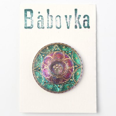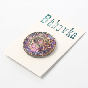 こちらは北チェコで長い間製造されてきたガラスボタンで、ひとつひとつ手で打ち出され彩色も職人さんによる手作業でのもの。手に取って頂けると美しいブローチのような大きなガラスボタンです。表面が少し盛り上がり、ガラス肌の分厚い円形のボタンで、表と裏の両面から彩色が施され、奥行きのある作りになっています。裏からは金属塗料が塗られているため、グリーンやピンクのお色が内部から美しく映えます。表面に金彩が施されていて華やかさも。留め具や帯留め、アクセサリーなどにもおすすめです。