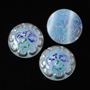 こちらは北チェコでガラスボタン工房で製作されたガラスカボション。ひとつひとつ手で打ち出され彩色も職人さんによる手作業でのものです。直径は1.8cmです。こちらは緩やかに中央の盛り上がった表面にバロック調のカービーな植物紋様が銀彩で施されています。優雅でノスタルジックなデザインです。石鹸水のような乳白色のガラスを使用したちょっと珍しいお品です。