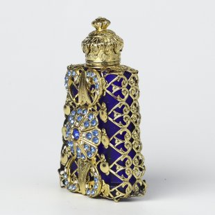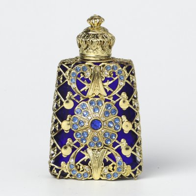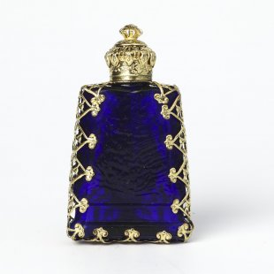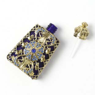 こちらはチェコのガラス製香水瓶で昔から作られているチェコスロヴァキアでは定番の商品。ガラスを型にはめてフォーミングする製法で作られています。また、北チェコの工房で一つの家族が丁寧に手作業で製作している工芸品的な香水瓶です。深海ブルーのお色のガラス瓶は長めの台形、表面にはフィリグリーとバロック様式のふくよかな作りの金属飾り、またクリアブルーのガラスカボションがはめられています。蓋には内部にガラス棒が付いていて香水に浸る感じになります。大変豪華で存在感があります。お気に入りの香水を小分けにして携帯することも可能です。また、棚などに飾ると華やかで可愛らしいインテリア・アイテムになります。新品&ノスタルジックな香水瓶、とてもチェコらしい一品です。またプレゼントとしてもおすすめです。