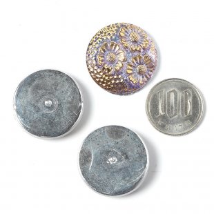 昔ながらの製法で制作されている手打ちガラスカボション。職人さんの手作りで再入荷品です。表面にはひなぎくのお花が3つ、また鎚目加工の様な細かな模様がはいっています。裏から金属塗料が塗布され、また表面からは金色の塗料が塗布されています。お色は人気のヴィトレイルカラー。ブルーやパープルのお色が混ざり合う美しいカラーです。ちょっとアールデコな懐かしい雰囲気も持っているお品です。ブローチや帯留めなどにするのもアイディアです。