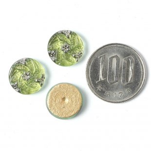 こちらは北チェコのガラスボタン工房で作られている手打ちのガラス・カボションです。こちらのカボションは直径が約1.3cmあります。一つ一つ打ち出しや彩色も職人さんの手作業で行われています。裏から金属塗料が施され、お色は奥行きのある黄緑色です。花ぐるまのデザインで、銀彩も施されています。爽やかな雰囲気のガラスカボションです。こちらは2個売りですのでご留意ください。ガラスボタンと同じデザインですが、裏には糸通しのリングがないため、アクセ・パーツとして使用される方には大変便利です。