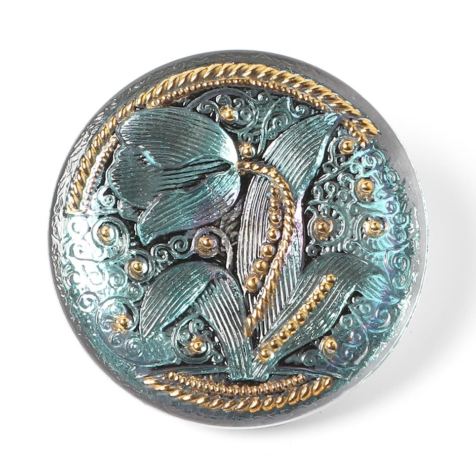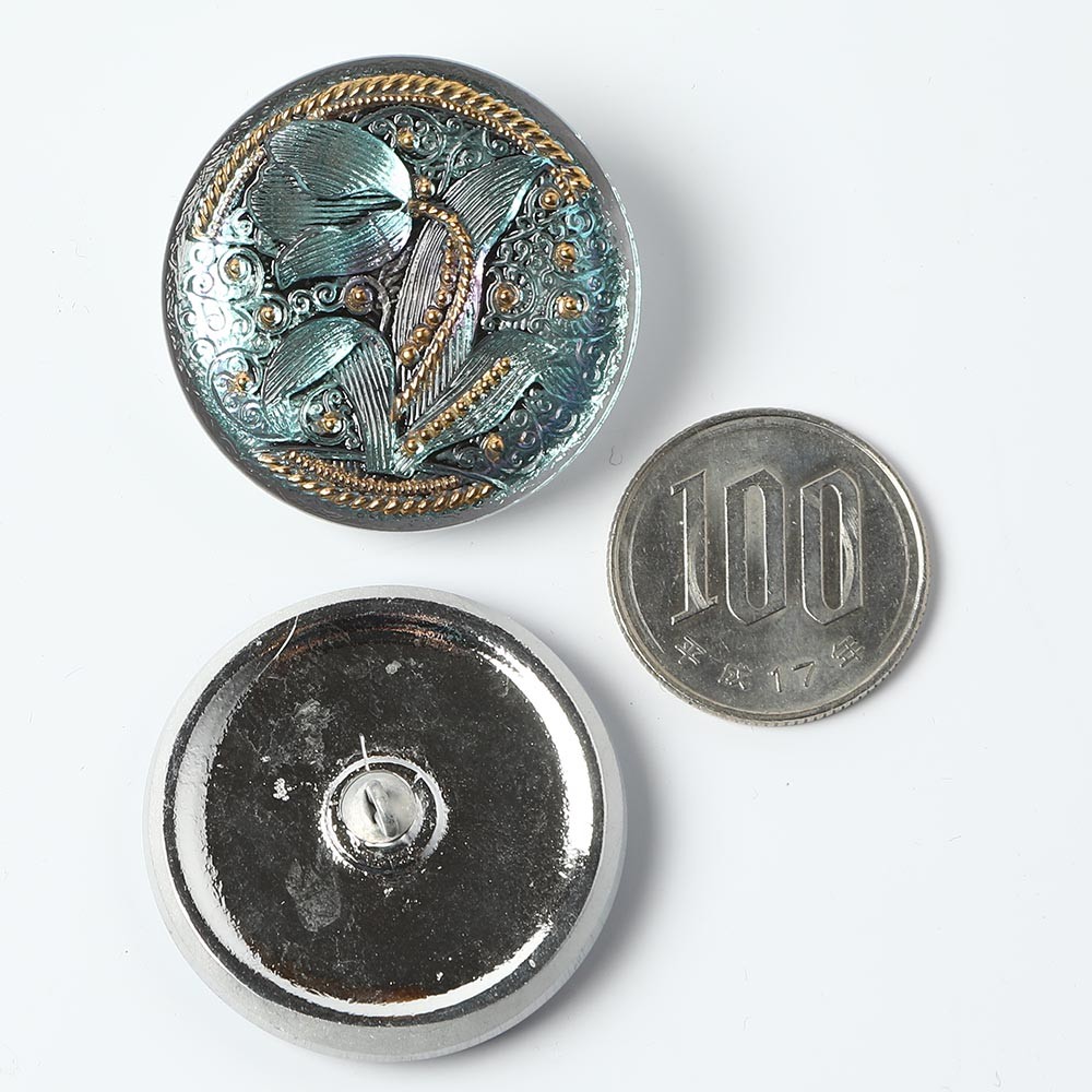 こちらは北チェコのガラスボタン工房で作られている手打ちガラスボタン。直径が約3.2から3.3cmあります。一つ一つ手作業による手打ちで行われ、手間をかけて作られたガラスボタンです。定番のチューリップのデザインです。裏から金属で裏打ちされ、内側からヴィトレイル・ブルーのお色です。表面の金彩もエレガントな雰囲気を添えます。涼やかでブローチのような貫禄があり留め具などにするととても素敵です。帯留めなどにリメイクするのもありです。