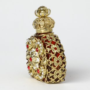 こちらはチェコのガラス製香水瓶で昔から作られているチェコスロヴァキアでは定番の商品。ガラスを型にはめてフォーミングする製法で作られています。また、北チェコの工房で一つの家族が丁寧に手作業で製作している工芸品的な香水瓶です。扇型のコーラルレッドの香水瓶です。表面にはレースのようなフィリグリーの装飾、またカットガラスも散りばめられています。蓋には内部にガラス棒が付いていて香水に浸る感じになります。大変豪華で存在感があります。お気に入りの香水を小分けにして携帯することも可能です。また、棚などに飾ると華やかで可愛らしいインテリア・アイテムになります。新品&ノスタルジックな香水瓶、とてもチェコらしい一品です。またプレゼントとしてもおすすめです。