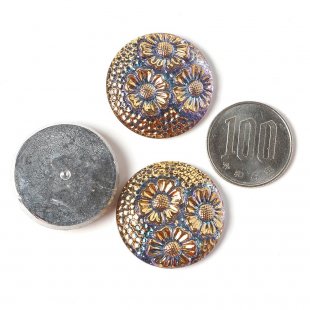 昔ながらの製法で制作されている手打ちガラスカボション。職人さんの手作りです。表面にはひなぎくのお花が3つ、また鎚目加工の様な細かな模様がはいっています。裏から金属塗料が塗布され、また表面からは金色の塗料が塗布されています。お色は人気のヴィトレイルカラー。ブルーやパープルのお色が混ざり合う美しいカラーです。ちょっとアールデコな懐かしい雰囲気も持っているお品です。ブローチや帯留めなどにするのもアイディアです。