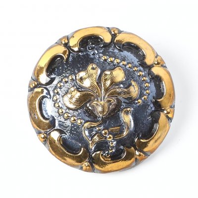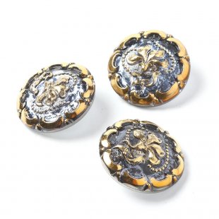 こちらは北チェコでガラスボタン工房で製作されたガラスボタン。手で打ち出され彩色も職人さんによる手作業でのものです。直径は2.7cmある大きめのボタンで存在感があります。こちらは緩やかに中央の盛り上がった表面にバロック調のカービーな植物紋様が金彩で施されています。お色は彩度を抑えた上品なシルバーパープル。優雅でノスタルジックな雰囲気です。裏面から金属塗料が塗布され、奥行きのあるピンクパープルのお色です。工芸品と言える大変手間のかかった一品でブローチ、帯留めにしても素敵です。