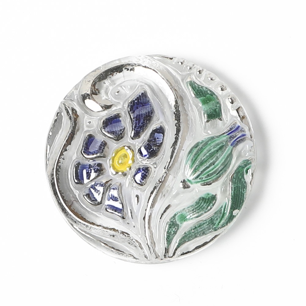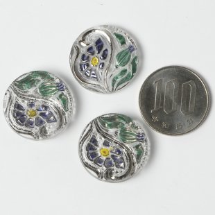 こちらは北チェコのガラスボタン工房で作られている手打ちガラスカボション。直径は約2.2cmです。こちらのボタンは透明なガラス製で、表から優雅な植物文様のモチーフが施されています。青い花にシルバーの金属塗料も塗布されています。涼やかな優しい雰囲気が素敵です。