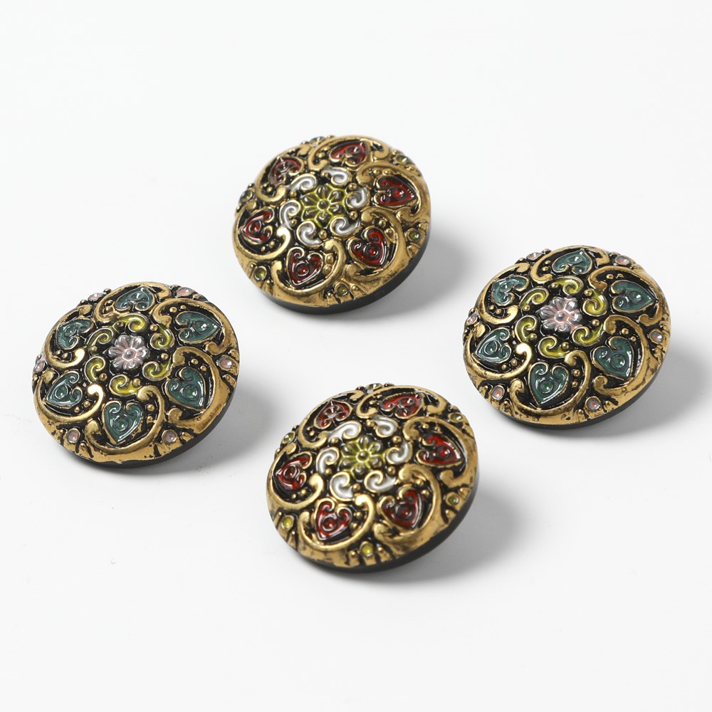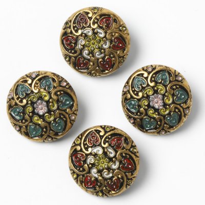 こちらはバーボフカで長年集めてきた貴重なガラスボタンのご紹介です。模様とペイントが大変繊細なヴィンテージのガラスボタンです。アンティークではありませんが、ペイントの複雑なものは現在工房でなかなか見つけづらくなりました。カラーは2色、それぞれ2つの4個セットでのご提供です。ちょっと和な雰囲気もあり、帯留めなどにもおすすめです。ブローチのような雰囲気の豪華さです。コレクションにもおすすめです。
