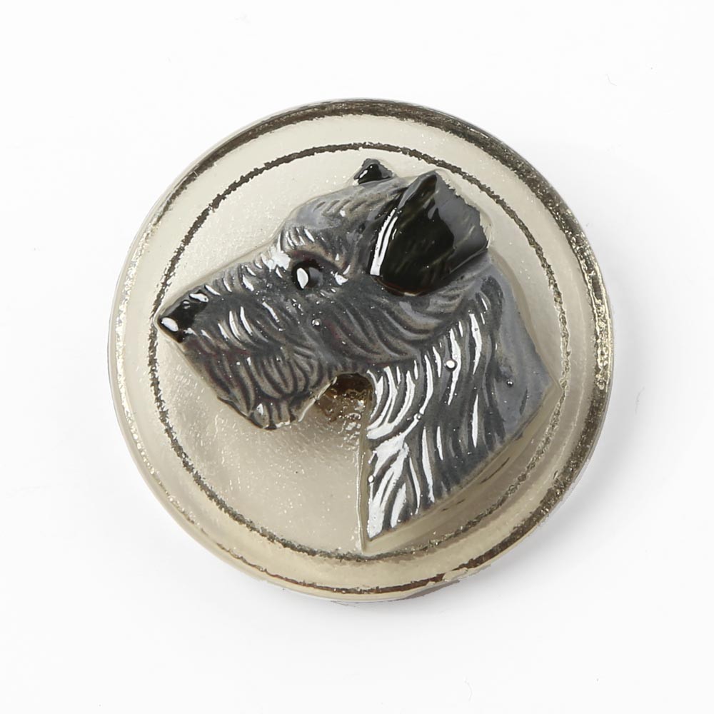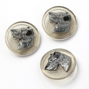 こちらは犬のテリアの横顔のガラスボタン。グレーのテリアでキリッとした男前です。彩度を抑えた薄い黄緑色のガラスで、テリアには手描きでグレーのペイントが施されています。犬が好きな方にもそうでない方にもおすすめです。日本ではなかなか入手困難なデザインのガラスボタンかと思います。(入荷して長期保管を放出しています。)