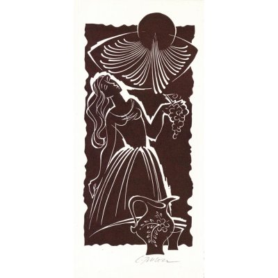 ラヂスラフ・ルセク(1927-2012)はチェコの画家、イラストレーター。30冊の書籍を出版した作家・詩人でもあります。本や雑誌のイラストも担当しました。共産主義化で禁止されながらも生涯を通じ、スカウト運動を本格的に取り組み貢献したことでも知られています。こちらはリノカットで製作された一枚で、少女がブドウを手に太陽を拝む様子が描かれています。太陽の光を浴びて恍惚とした表情が少し官能的です。インクのお色は黒に近い焦茶色です。下部には本人直筆の署名が入っています。年代表記はありませんが、作風から1970年代のものと推測します。近年彼のスカウトとグラフィックの功績を讃える郵便切手も発行され、評価の高まっている作家です。
