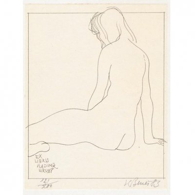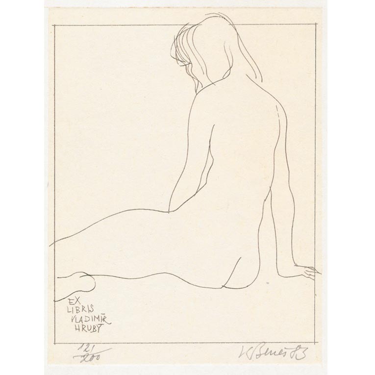 こちらはチェコのイラストレーター、グラフィック・デザイナーのカレル・ベネシュ(1932-2021)の制作したリトグラフ作品です。ウラヂミール・フルビーという人物の為に制作された蔵書票です。ベネシュは女性のヌード作品も数多く制作してきました。細い線描で描かれたモノトーンのもので、ゆったりと寛ぐ女性の後ろ姿が描かれた一枚です。ベネシュは絵本などのイラストも手がけ、チェコ人には馴染み深いイラストレーターで、市場でも人気の高い作家です。ナンバリングは121/200、鉛筆にて本人直筆の署名入りです。台紙に貼られていて、その上から作家が署名しています。額に入れて飾るとおしゃれなインテリアになります。1983年の作品です。