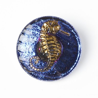 こちらはチェコのガラスボタン工房で制作されているガラスボタン。表面にはタツノオトシゴのモチーフにゴールドの塗料が塗布されていてキュートなボタンです。裏面から金属塗料が塗布され、発色の良いブルーパープルのお色です。角度によってショッキングピンクも見え隠れする華やかな仕上がり。アクセサリーや留め具などにすると素敵です。