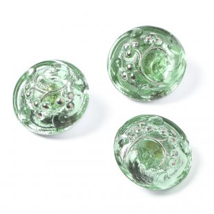 こちらは北チェコのガラスボタン工房で作られている手打ちボタン。こちらのボタンは直径が約1.8cmのボタンです。こちらのボタンは、透明なグリーンのガラス製で、中央が盛り上がったポッコリとした形のガラスボタンです。表面にはカーブが特徴的な植物モチーフが銀彩で施されています。一つ一つ手作業で手間をかけて作られたガラスボタン。またガラス本来の質感のお楽しみいただける涼やかな印象の一品。服のボタンのほか、アクセサリーの材料としてもおすすめです。