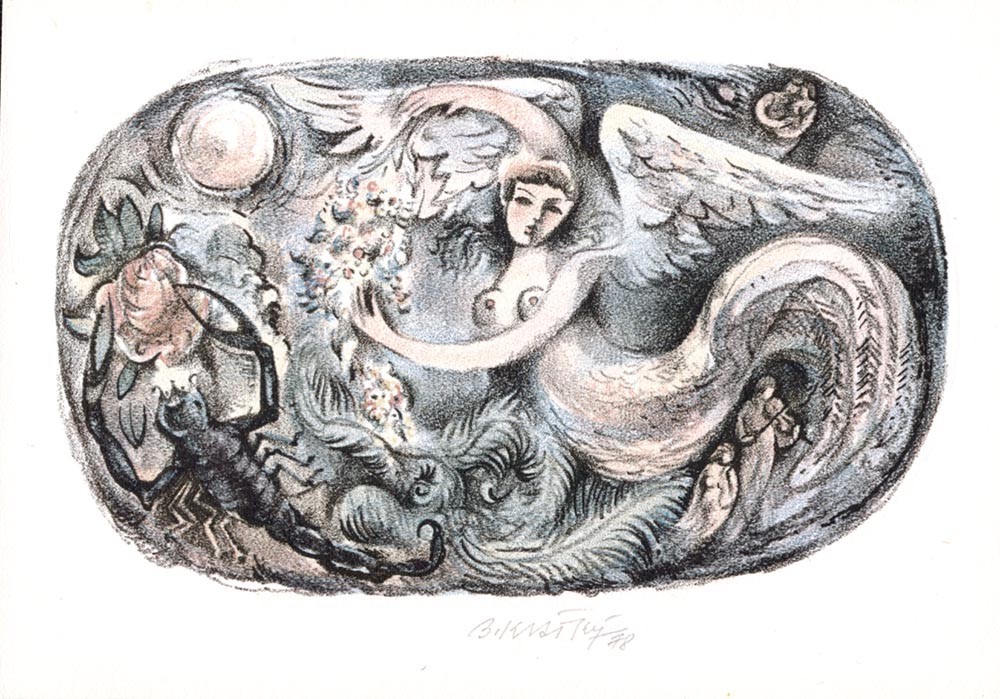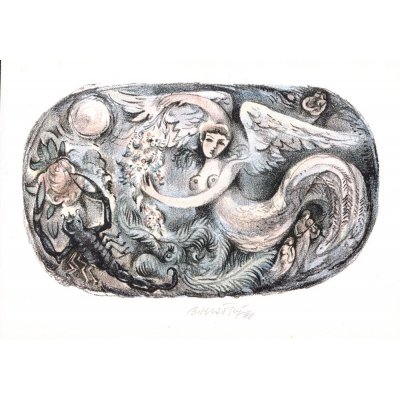 こちらはボフミル・クラートキー(1913-2005)の制作した蔵書票。ボフミル・クラートキーはチェコの画家でイラストレーター。寓意的な絵画やシュールな作品を残し、蔵書票やリトグラフ作品も数多く残しています。国内外で人気のある著名な画家です。こちらは彼の得意とする寓話の世界のイラスト。月夜に踊るような羽の生えた美しい人魚やカップル、音楽家などの姿が描かれています。柔らかい色使いの素敵なイラスト。額に入れて飾るものおすすめです。
