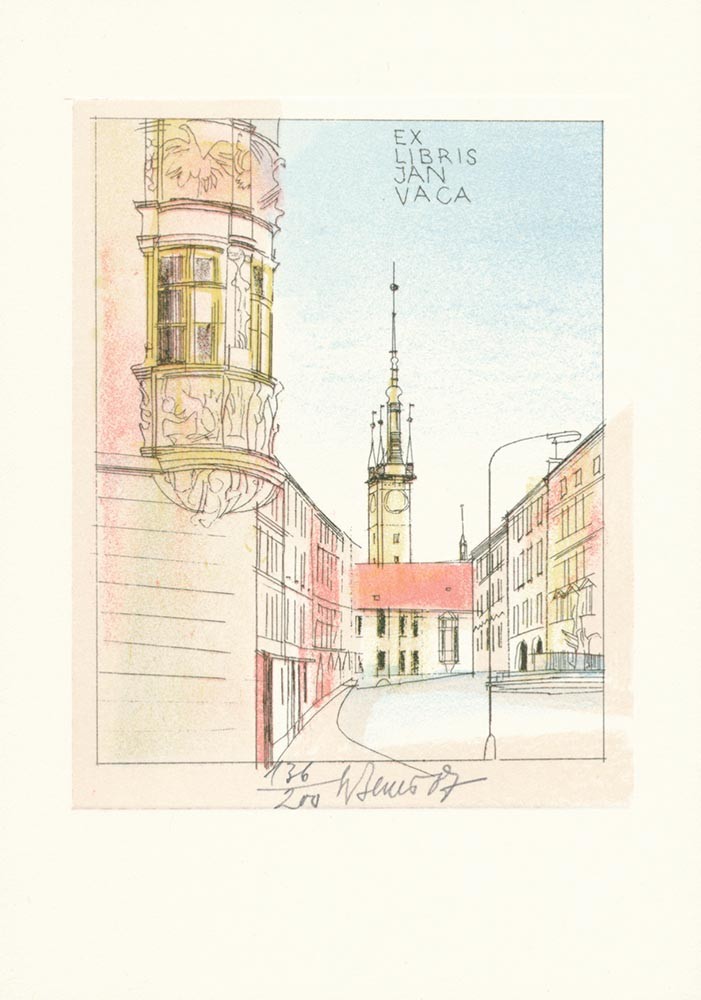 こちらはチェコのイラストレーター、グラフィック・デザイナーのカレル・ベネシュ(1932-2021)の制作したリトグラフ作品。カレル・ベネシュは蔵書票やリトグラフ作品、絵本のイラストも手がけ、チェコ人には馴染み深いイラストレーターで、市場でも人気の高い作家です。こちらはチェコのある街の広場を描いた蔵書票です。パステルカラーの柔らかいお色を使った明るい雰囲気のイラストです。額に入れて飾ると素敵なインテリアになります。ナンバリングは136/200。1987年の作品で本人の直筆署名入りです。