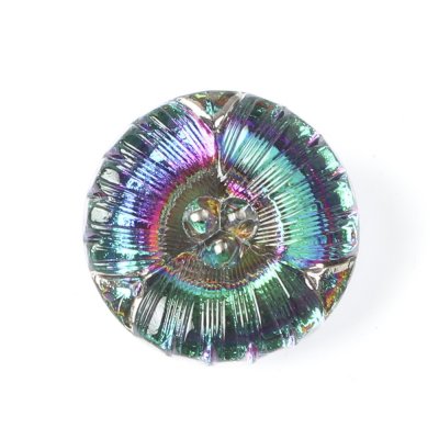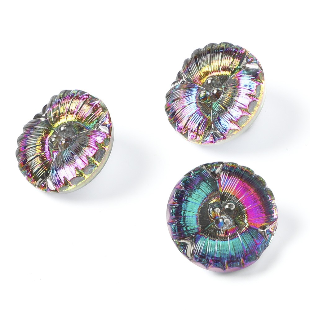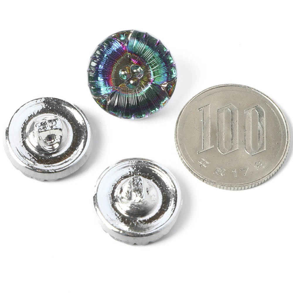 こちらはチェコのガラスボタン工房で製作されている手打ちのガラス・ボタンです。こちらは直径が約1.8cmあります。一つ一つ打ち出しや彩色も職人さんの手作業で行われています。裏面から金属塗料を塗布し、ショッキンググリーンやピンクの色がガラスの奥から輝く美しいカラーリング。かなり彩度の高い仕上がりです。3枚の花弁のお花のデザインのガラスボタンです。ふくよかなデザインのお花で、銀彩も施され上品で華やかです。
