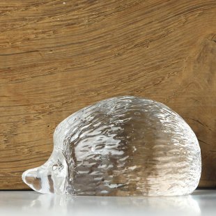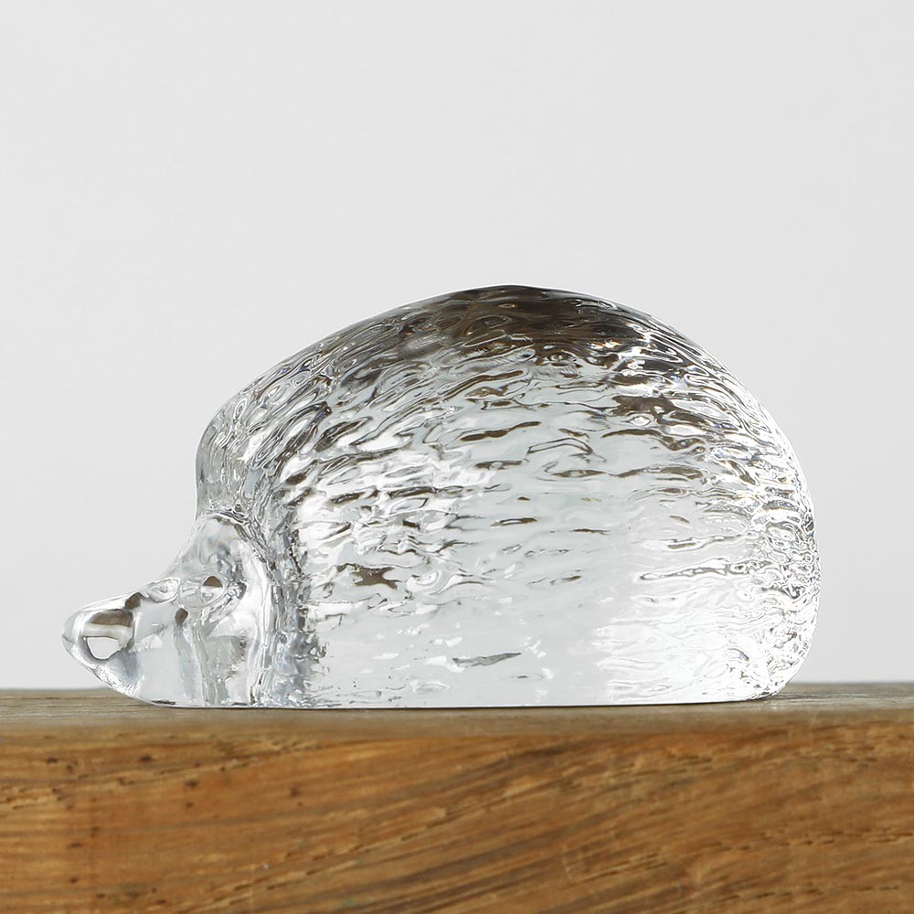 こちらはチェコならではのガラス製はりねずみの置物。文鎮として制作されているものです。型にガラスを流して造るチェコの伝統工芸品でこちらでも人気のコレクターズアイテムです。透明のガラスを使用したもので、デッドストックの商品。ヒビやかけのない状態もパーフェクトなものです。おっとりとした佇まいのハリネズミさんはチェコならではのアイテム。優しい雰囲気があり、机周りを素敵に演出します。インテリアとしてどこにおいても、可愛らしく絵になる一品です。