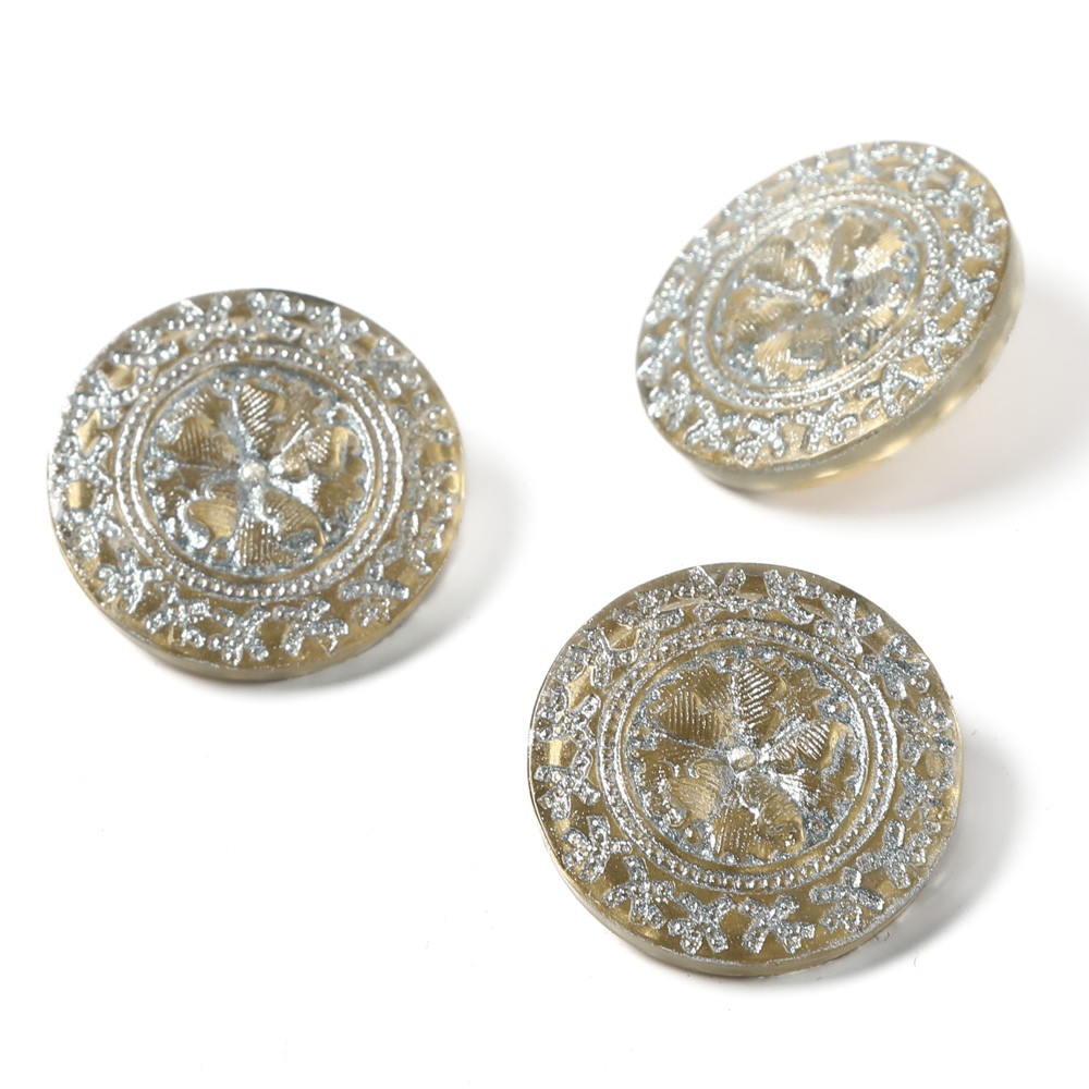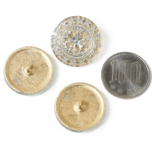 こちらは北チェコのガラスボタン工房で作られている手打ちガラスボタン。直径が約2.3cmあります。一つ一つ打ち出しや彩色も職人さんの手作業で行われるガラスボタンです。表面にはリースやお花の細かな模様が施され、裏からマットゴールドの金属塗料が塗布されています。表面には模様の中にマットホワイトの塗料も入れ込まれ、柔らかいコントラストが綺麗です。上品で華やかな雰囲気があります。女性らしいフェミニンな一品です。一つひとつハンドペイントで丁寧に制作されたガラスボタンです。