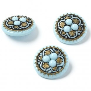 バーボフカが長年コレクションしてきたアンティークのガラスボタンからのお品です。不透明の水色のガラスを使用したボタンで表面にはアンティークらしい意匠を凝らした模様が入っています。ハンドペイントで色付けされ、手作りの温かみのあるガラスボタンです。ガラスボタンはひとつひとつ水洗してあり、ペイントが剥がれなかったものだけ販売しています。詳細は写真でご確認ください。1920年頃のカードに縫いつけてあった100年古いアンティークです。