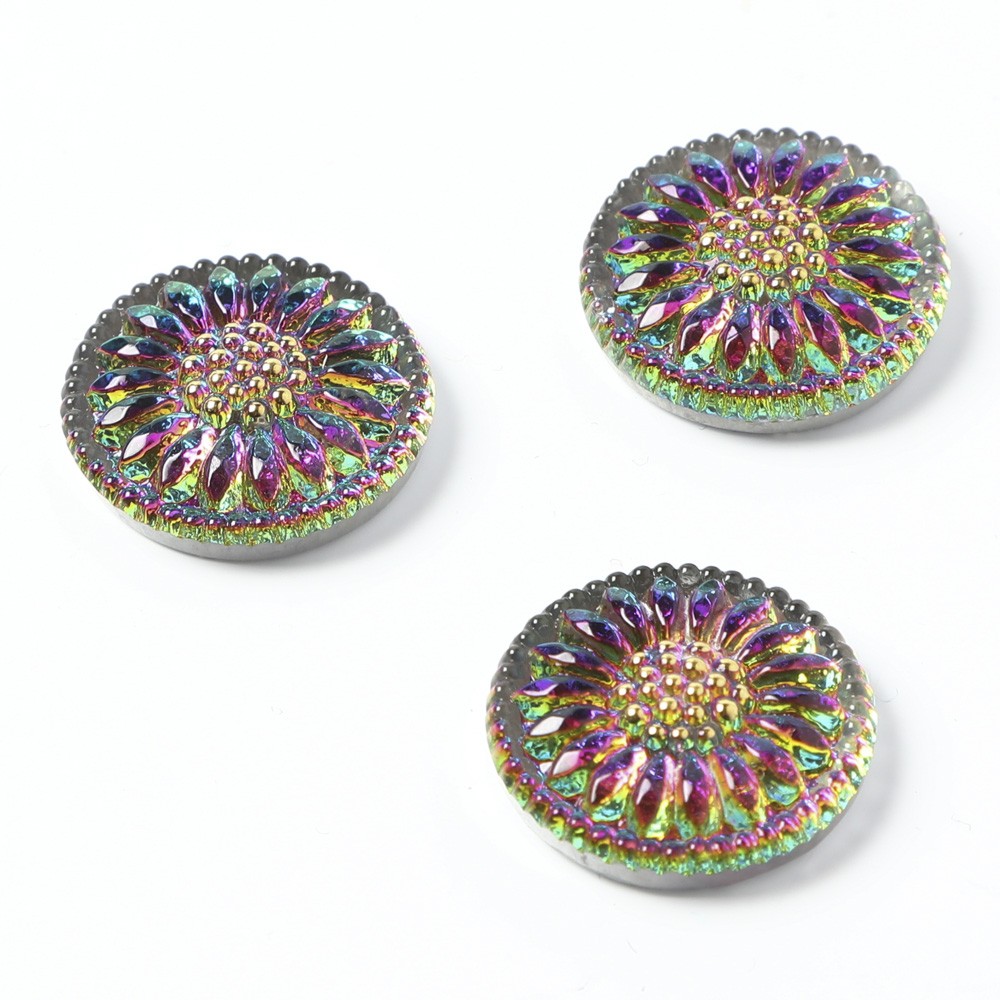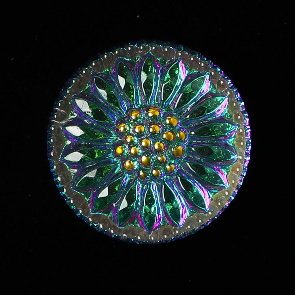 こちらはチェコのガラスボタン工房で製作されている手打ちのガラスカボションです。直径が約1.8cmあります。打ち出しや彩色も職人さんの手作業で行われています。ひなぎくのモチーフで裏から金属塗料が塗布され、奥行きのあるメタリック・グリーン。角度を変えるとピンクやイエローのカラーも見えます。おしべには手作業で金彩も施され、明るい雰囲気の一品です。複数写っている写真もありますが、こちらは1個での販売になります。こちらはカボションですので、裏面はボタン通しがなく、平らですのでアクセサリー作りの材料としては便利かと思います。