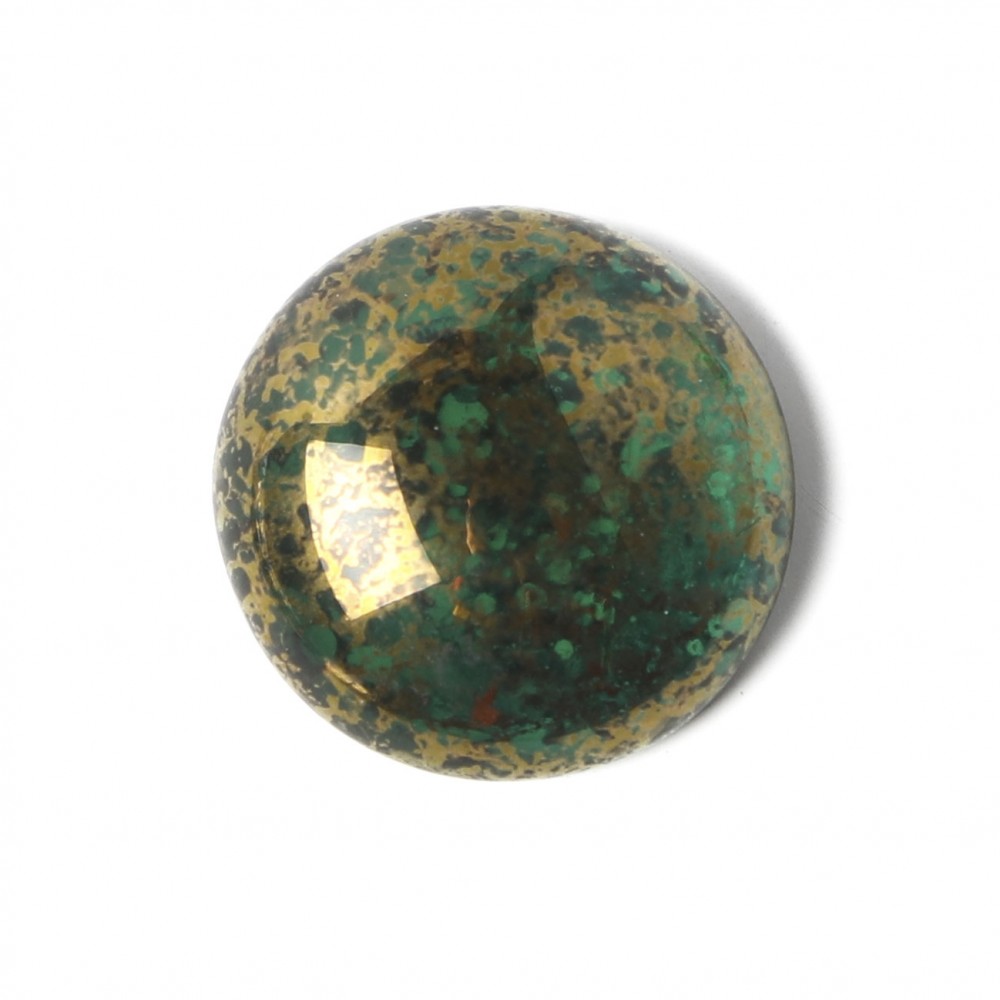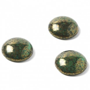 こちらはチェコのガラス工房からの新作のガラスカボションです。グリーンとゴールドが混ざって、天然石のような風合いの美しい仕上がりです。形自体はぽっこりと丸みを帯びたシンプルなものです。フォルムはひとつひとつ手作りですので、パソコンで描くような完璧な丸ではございませんので、ご了承ください。(写真をご参照ください。)ガラスの国チェコからのとっておきのカボションです。