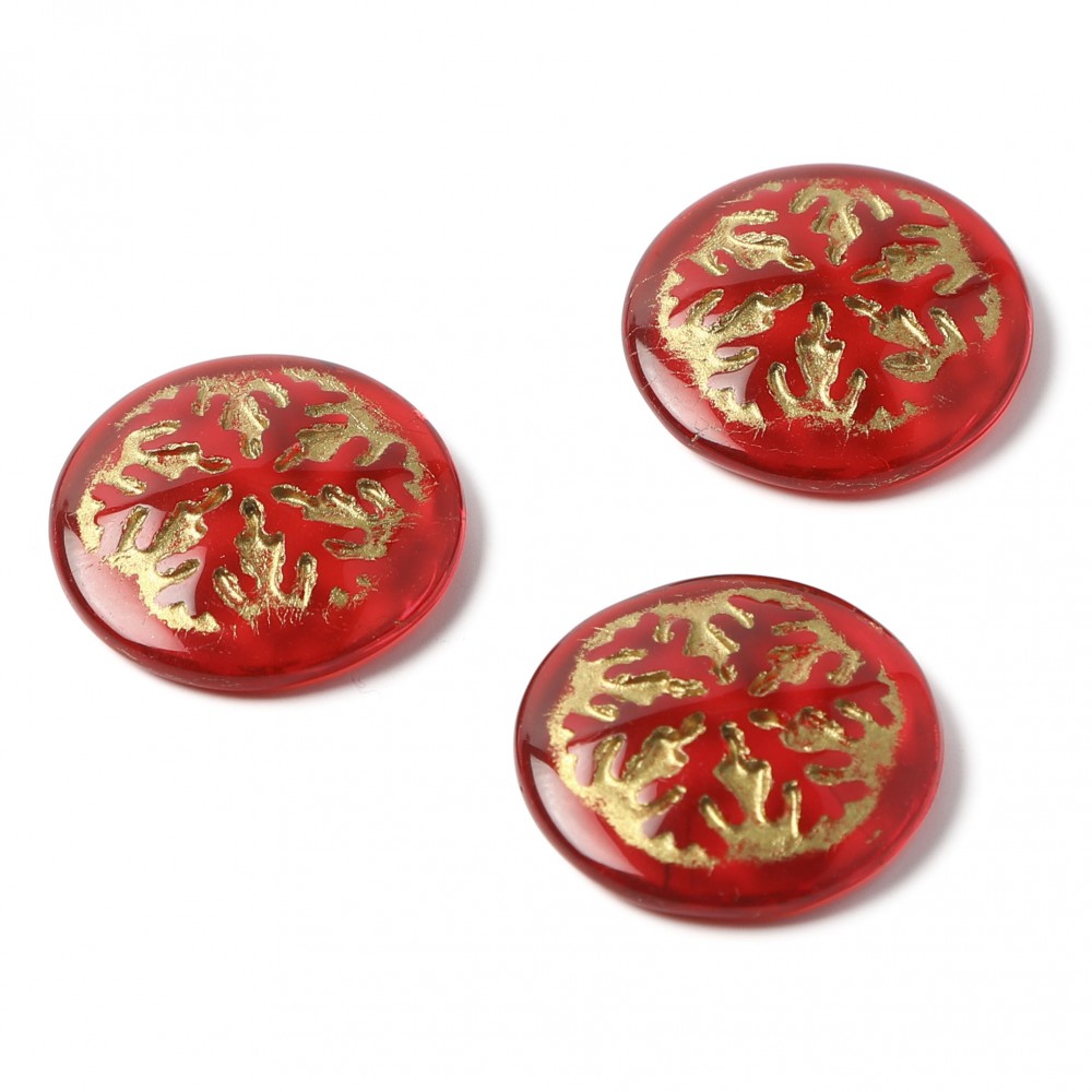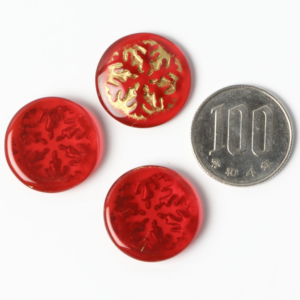 こちらはチェコのガラス工房からの新作のガラスカボションです。透明の赤いガラスを使用しています。表面には雪の結晶の模様が入り、ゴールドの塗料が塗布され、コントラストがきれいです。フォルムはひとつひとつ手作りですので、パソコンで描くような完璧な丸ではございませんので、ご了承ください。(写真をご参照ください。)ガラスの国チェコからのとっておきのカボションです。
