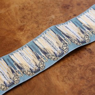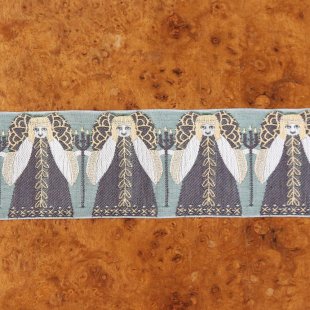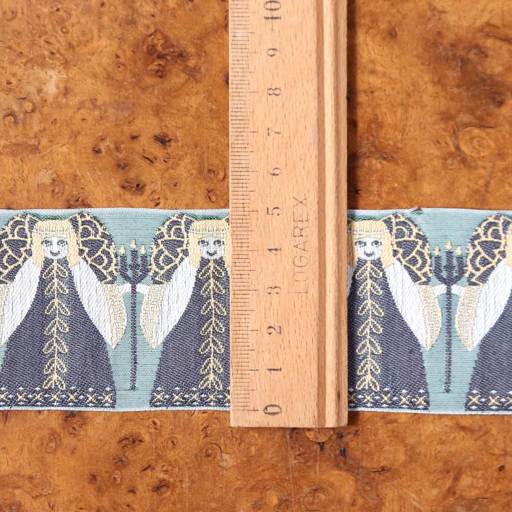 こちらはドイツ製のジャガード織りのリボン。カフカ夫人によって閉鎖された工場の技術が復刻され、今ではカフカリボンとして知られています。幅広の5cmのリボンです。こちらはグレーがかったグリーンの地にキャンドルを持つ天使が織り込まれています。個性的な美しいお柄です。100年以上古い織り機を使ってパンチカードにより昔ながらの製法で作られている美しく素敵なリボンです。幅広5cmでバックなど縫い付けてアクセントするととってもかわいい雰囲気に仕上がります。直で仕入れていますので、日本で購入いただくよりお求め安い価格でご提供です。素材もコットン90%、ポリエステル10%で品質のよいものです。