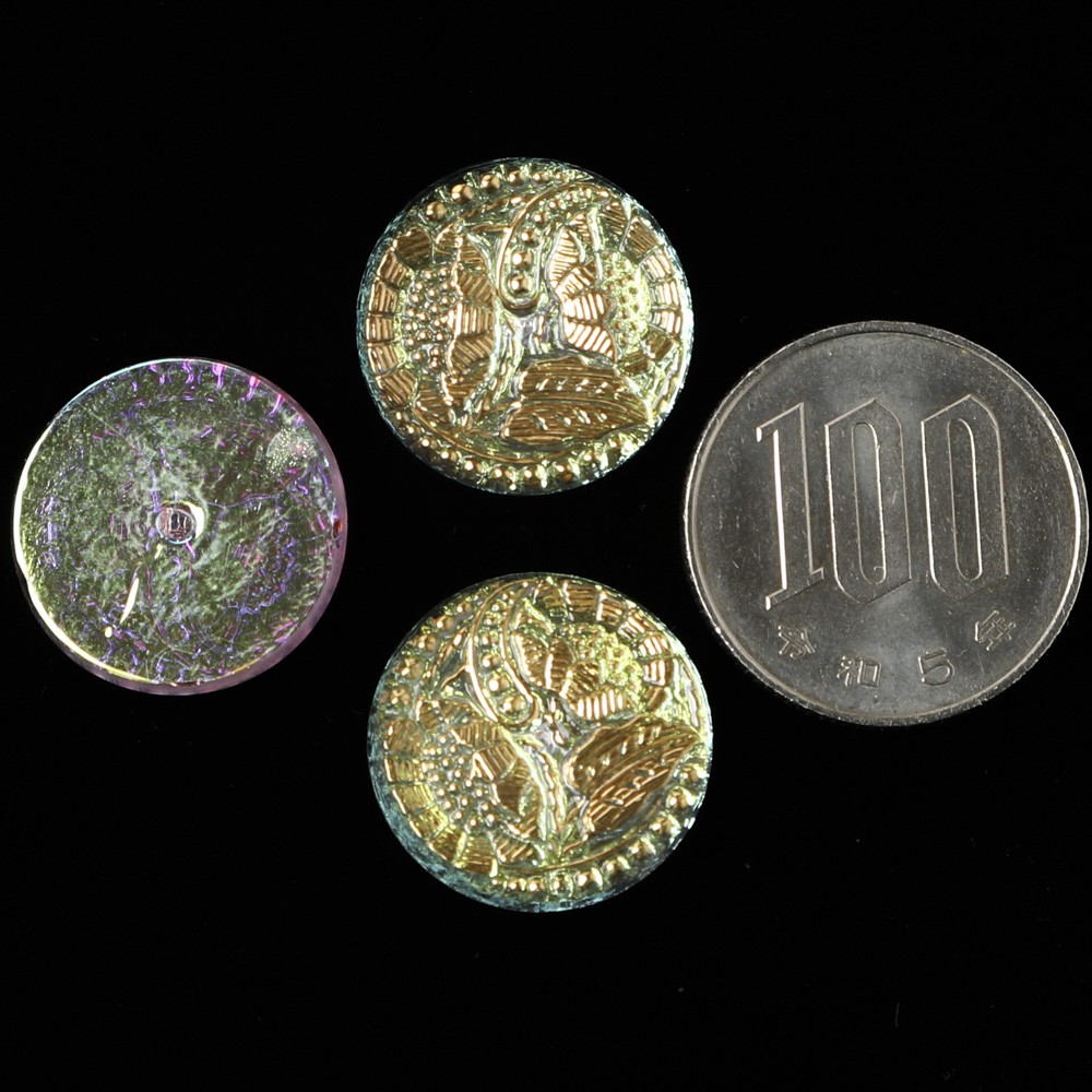 こちらは北チェコでガラスボタン工房で製作されたガラスカボション。ひとつひとつ手で打ち出され彩色も職人さんによる手作業でのものです。直径は1.8cmです。こちらはひまわりモチーフ、裏面には金属塗料が塗布され柔らかなオーロラカラー、角度によってはピンク色にも見える不思議な色合いです。表面には金彩が施されています。華やかでガーリーなお品です。こちらのカボションは裏面の際に小さなかけのあるものがございます。その上から金属塗料が塗布され、工房からは完品として出荷されるものでございます。正面からの見た目としては全く問題ございませんが、ご了承の上ご注文をよろしくお願いいたします。