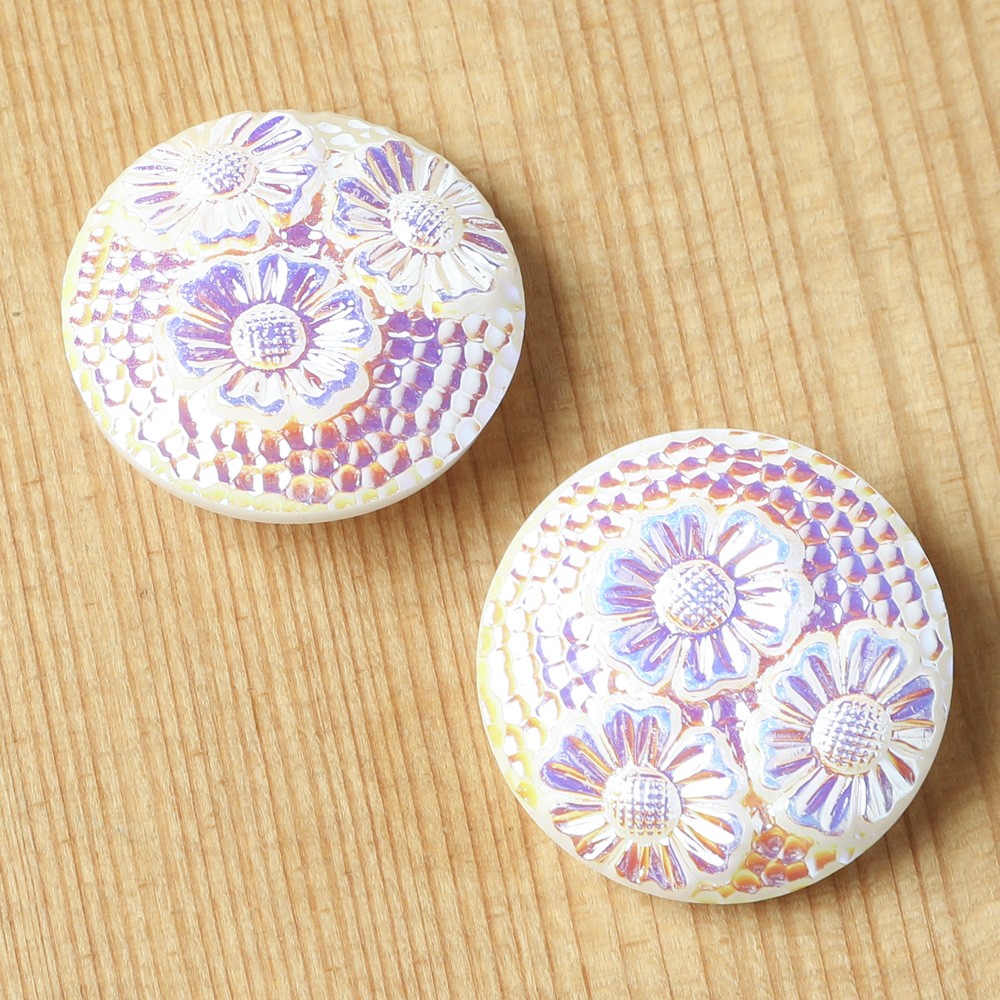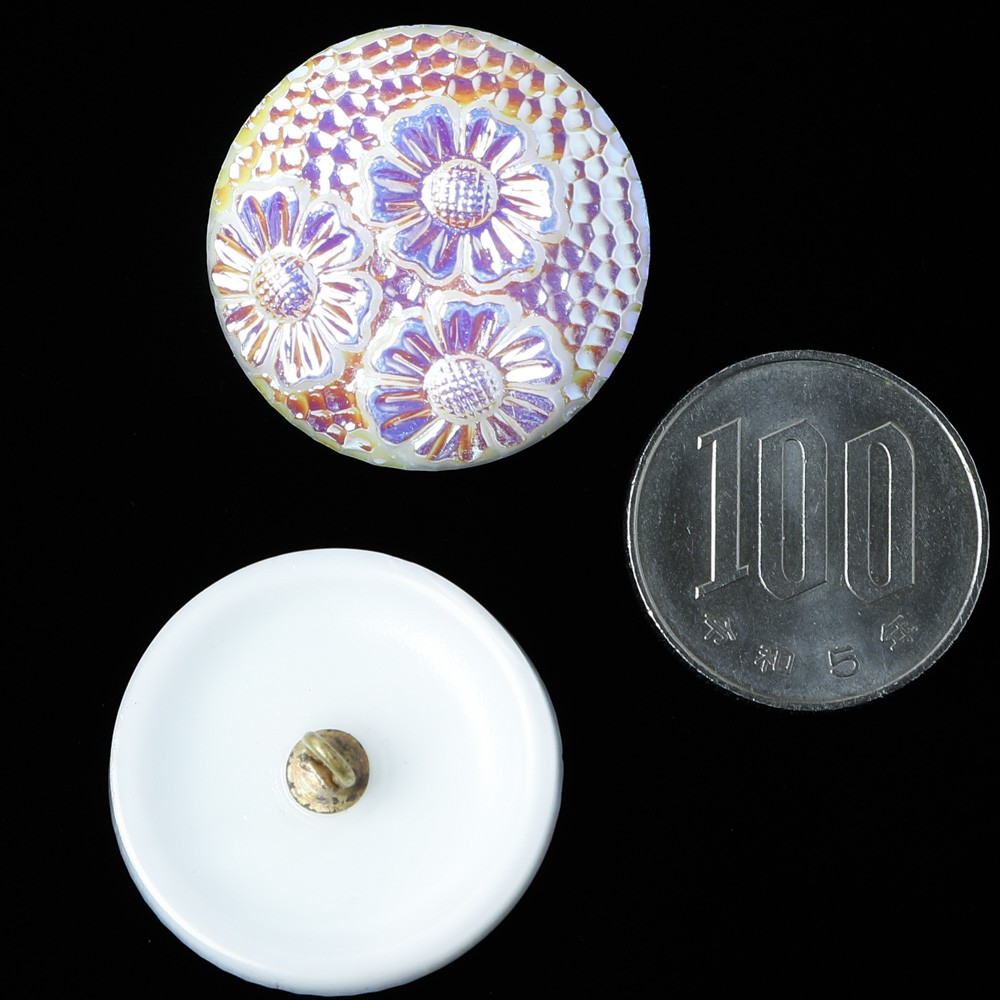 昔ながらの製法で制作されている手打ちガラスボタン。表面にはひなぎくのお花が3つ、また鎚目加工の様な細かな模様がはいっています。乳白色のガラスを使用したボタンで、表面にはうっすらと金属塗料が塗布されていて、少しメタリックな輝くもあります。太陽に反射する雪を思わせるようなお色です。ちょっとアールデコな懐かしい雰囲気も持っているお品です。ブローチや帯留めなどにするのもアイディアです。