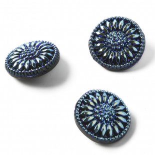 こちらは北チェコのガラスボタン工房で作られている手打ちガラスボタン。ひなぎくのお花のデザインのボタンです。直径は約1.8cmあります。一つ一つ打ち出しや彩色も職人さんの手作業で行われるガラスボタンです。金属塗料が塗布されメタリックブルーのお色です。冴えた耀きが美しいキリッとした印象のガラスボタンです。
