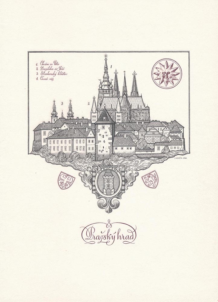 こちらはヨゼフ・ヘルチーク(1922-1999)の製作した銅板印刷のプラハ城を描いたグラフィック作品。ヨゼフ・ヘルチークは個人的に店長横山も大好きなグラフィック・アーティストです。何よりチェコスロヴァキア時代の切手の版を彫ってきた彫り師でもあります。彫り師としてはレジェンドとも呼べるような素晴らしい仕事を数多く残しました。まさにチェコ人の黄金の手を持つ職人です。こちらも例にもれず大変繊細な描写で、街の東側からプラハ城を望む写実的な描画で、チェコのライオンの紋章なども入り、デザイン的にもとても素敵な一枚です。プラハが好きな方には、きっとお馴染みの景色・・・額に入れて飾るのがおすすめのグラフィック作品です。残念ながら作者署名は入っておりません。