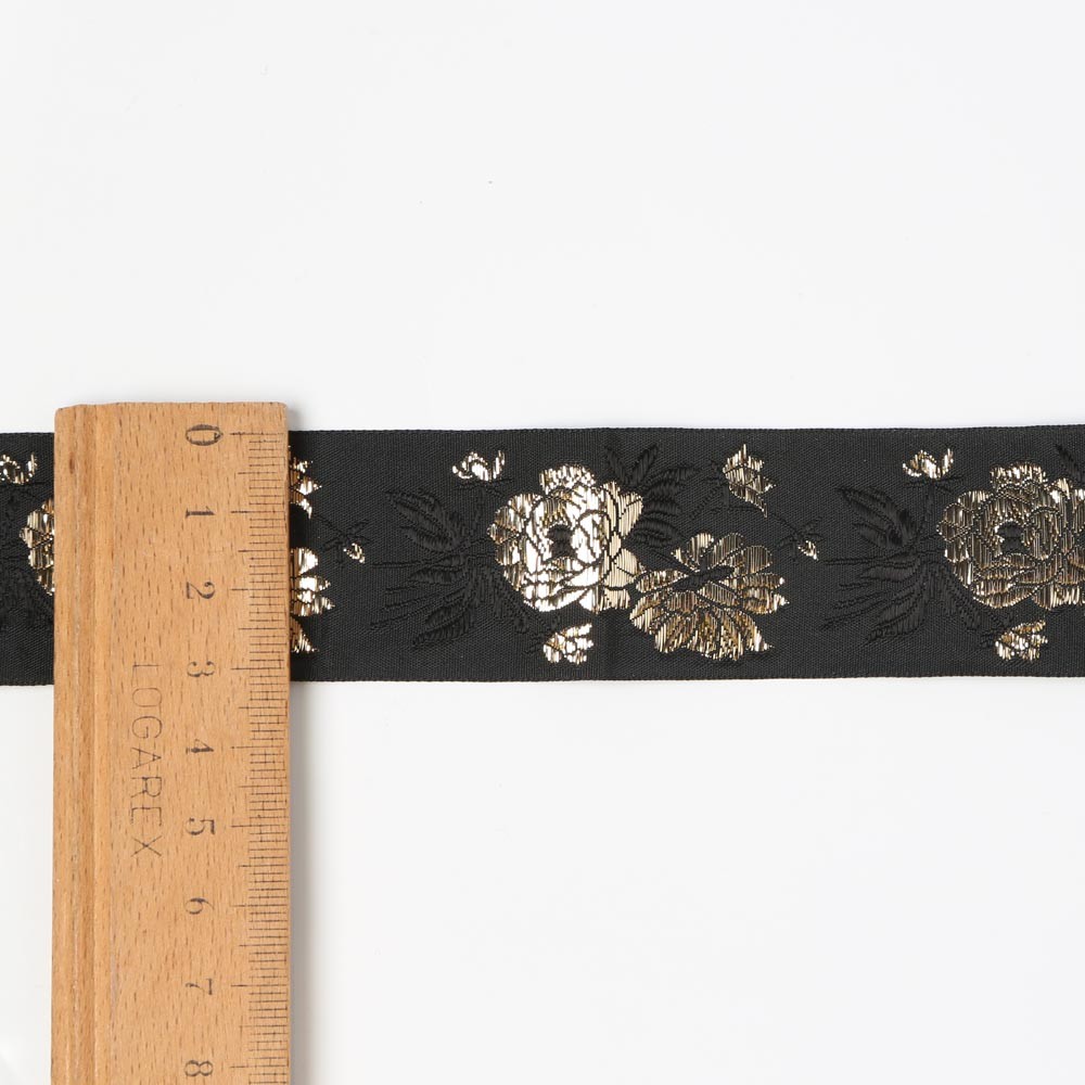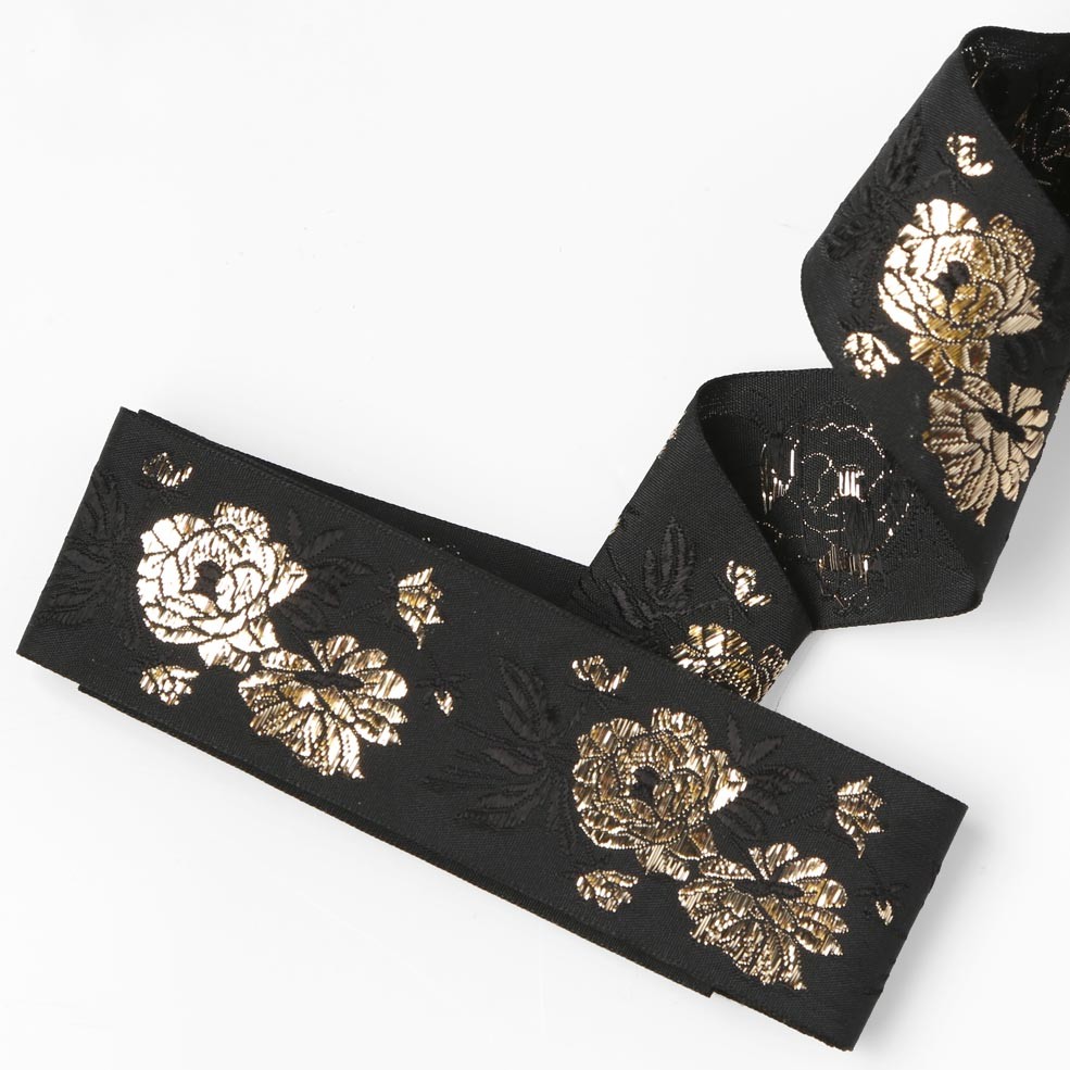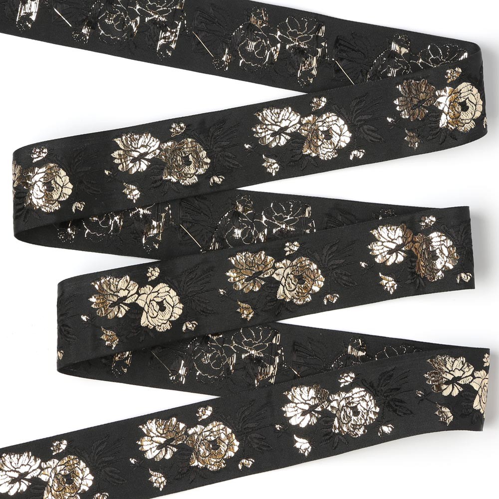 こちらはチェコの民族衣装に使用される黒い金糸の刺繍のリボン。ポリエステルの黒いリボンに黒い糸と金の色でバラの刺繍が施されているシックで美しいリボンです。大人っぽく金糸の輝くが豪華な雰囲気のリボンです。こちらはチェコの手芸屋さんの倉庫に長く眠っていたデッドストックの未使用品です。状態もとても良いものです。金糸はアイロンの高温に弱いため、アイロンがけは当て布をして低温にて行なってください。売り切りの288cmです。