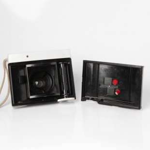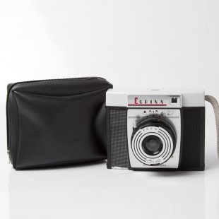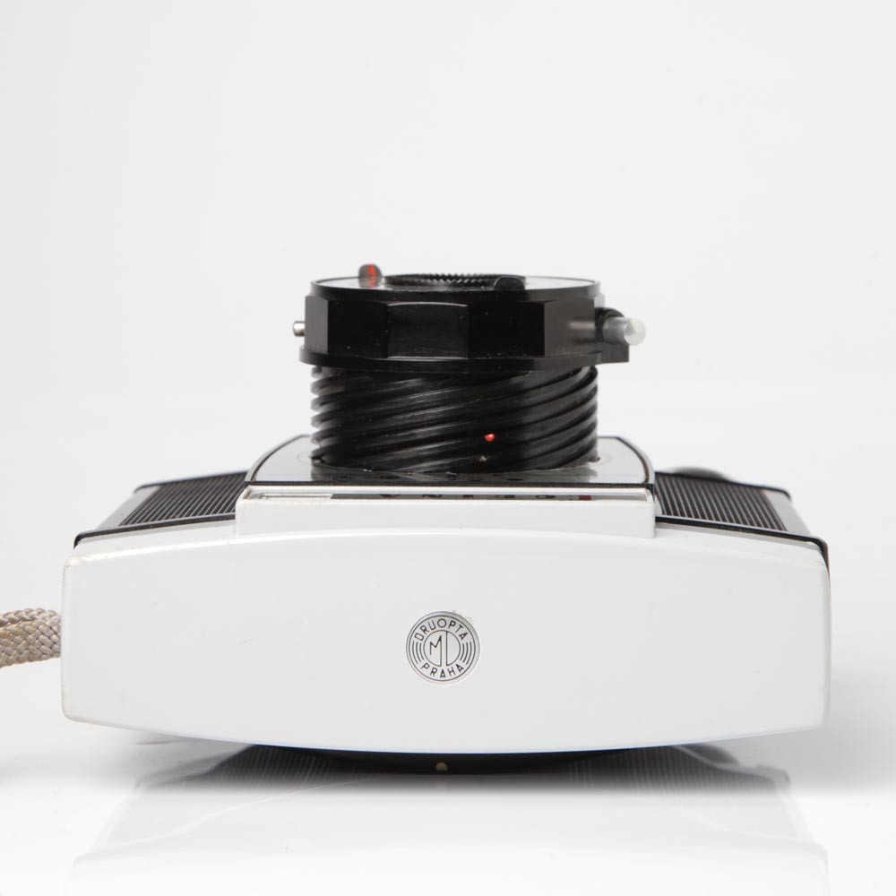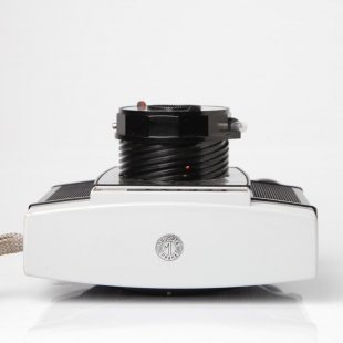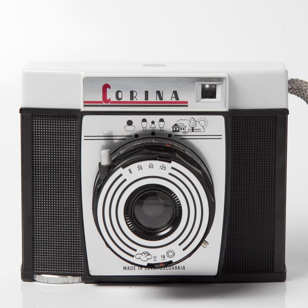 チェコスロヴァキア製カメラ、コリナ(CORINA)です。プラハにかつて存在したドゥルオプタ製です。チェコにはかつて複数のカメラ製造会社が存在し、その中でも老舗の一社です。こちらも子供たちも楽しめるカメラとして登場しました。全体的に大きめですがこじんまりとしたロゴやピント合わせの絵が大変かわいらしいデザイン製の高いカメラです。このカメラも沈胴式レンズでピントもレンズを回転させ、表示を絵に合わせて行います。シャッタースピードはバルブを含めて4種類。1/30,1/60, 1/125です。絞りは11と16の2種類。フィルムは普通のブローにフィルムを使用するので今でも問題なく入手で実際に撮影できます。カメラのロゴなどに色あせもなく(このカメラは通常軽く色あせがあります。)状態も良好です。レンズの状態もパーフェクト。ベークライトと呼ばれるプラスティックの一種の素材で出来ています。その素材自体も今となっては、すたれてしまった懐かしい素材です。トイカメラならではのノスタルジックな写りを楽しんで頂けます。また今回はオリジナルケースもついています。