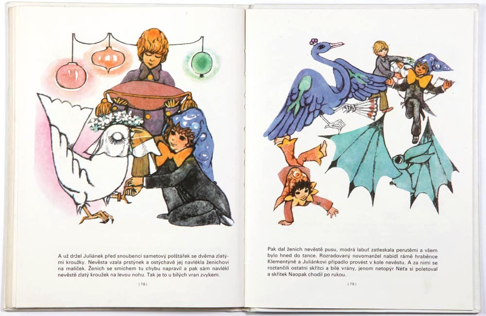 少年ユリアーネクと妖精のスクシーテックのお話。イラストは点描が特徴的なイトカ・ヴルボヴァーと著者はジョゼフ・ハンズリークのゴールデンコンビ。1976年の貴重な初版本です。少年ユリアーネクと妖精のスクシーテクがおとぎの国を春夏秋冬と旅する冒険のお話です。総ページ88。各ページ一に大きなイラストが描かれています。メルヘンあふれる想像豊かでダイナミックな描写の美しいイラストです。本の背に一部汚れがある以外は、状態も良好で本の中身もとても綺麗です。