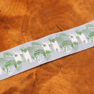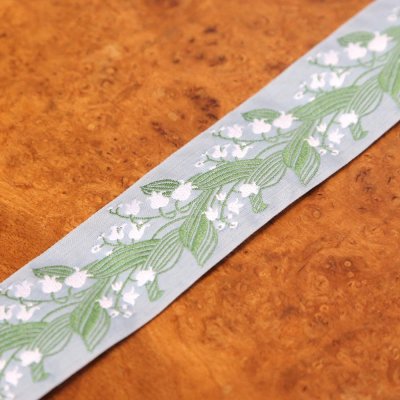 ドイツ製カフカ・リボン ジャガード織り グレーブルーにすずらん 幅4cm 156cm売り切り