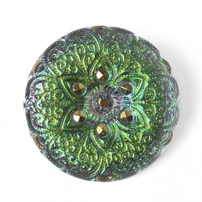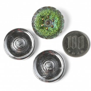 こちらは北チェコのガラスボタン工房で作られている手打ちボタン。こちらのボタンは直径が約2.7cmの大きなボタンです。透明のガラスを使用し、表面には大変繊細なお花の模様の優雅な雰囲気。中央の金彩のドットが華やかさを添えます。裏から金属塗料が塗布されていて、内側から深いグリーンのお色です。アクセサリーや帯留め、お洋服のボタンにするのもおすすめです。