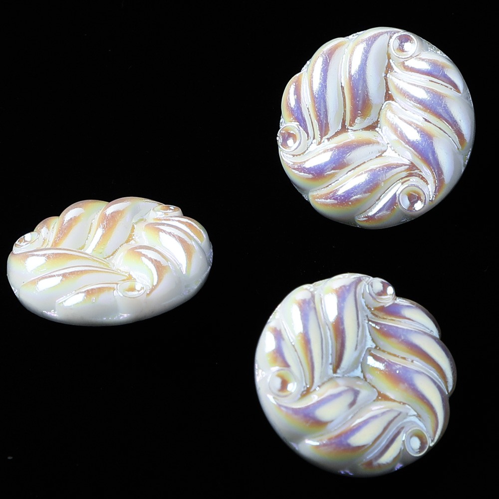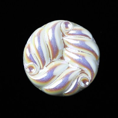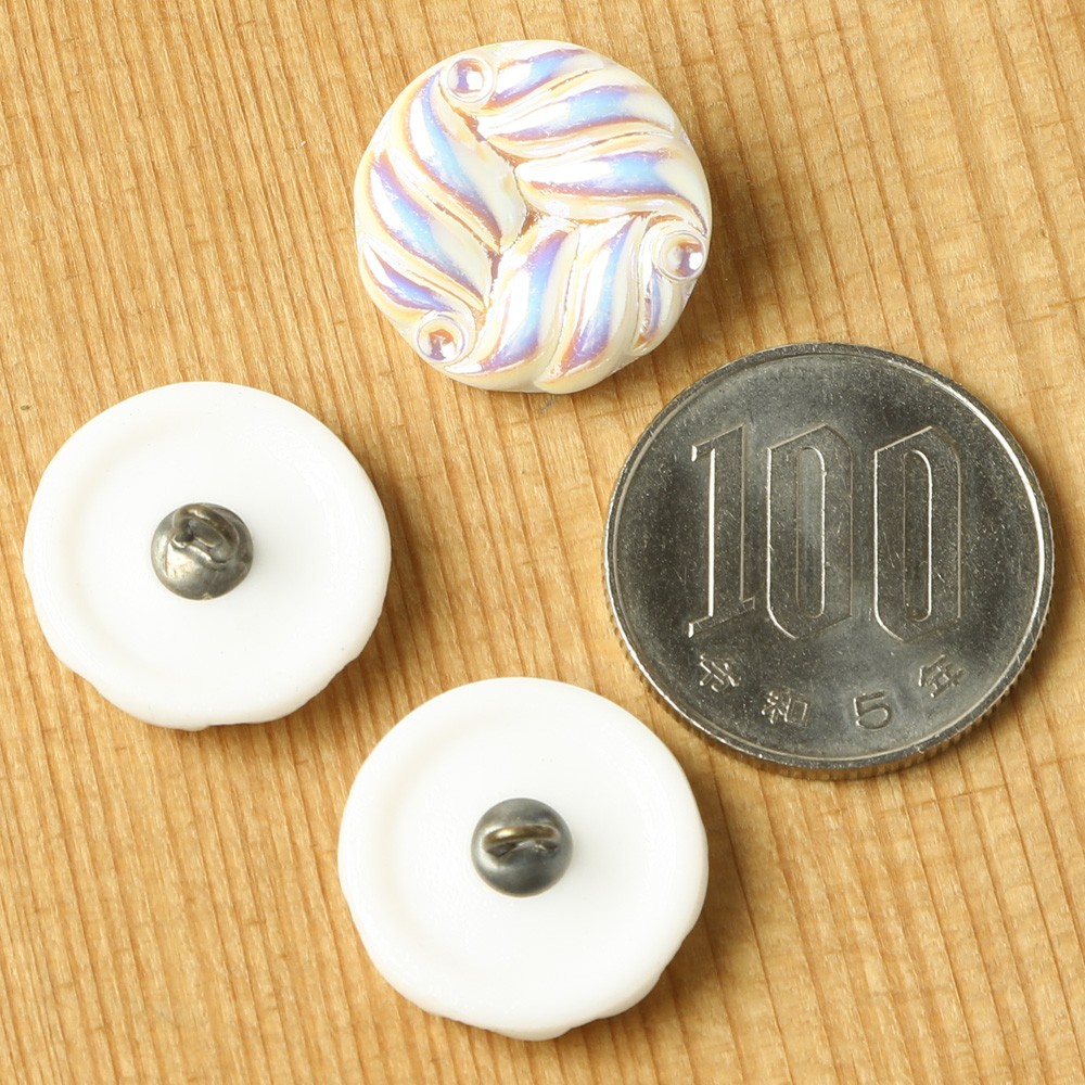 こちらは現行では少し珍しいデザインのガラスボタン。1950-90年代に製作されたボタンと同じ型を使用して復刻したガラスボタンかと思います。乳白色のガラスの表面に薄く金属塗料を塗布し、淡い虹色のニュアンスを足しています。ソフトクリーム見たいなデザインで、レトロな雰囲気の素敵なガラスボタンです。