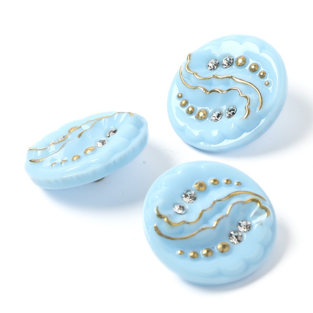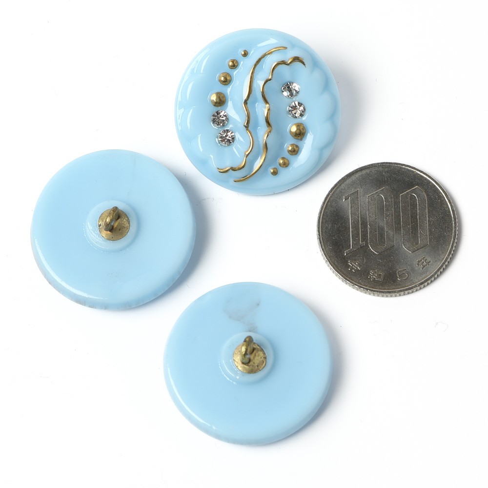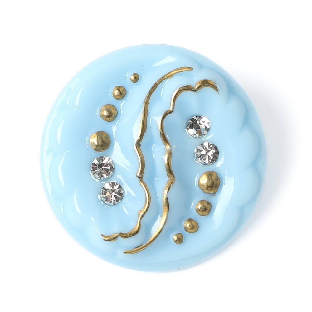 こちらペーズリーのモチーフのガラスボタン。不透明の水色のガラスを使用したペーズリーのデザインのガラスボタンです。またクリスタル・カットガラスがあしらわれています。ペーズリーの際に金彩も入っていて、完成度の高いブローチのようなボタンです。さすがチェコ、とても個性的でキュート!髪留めや帯留めなどにも素敵です。