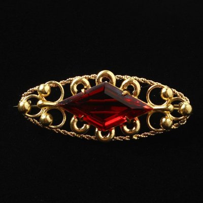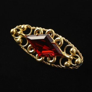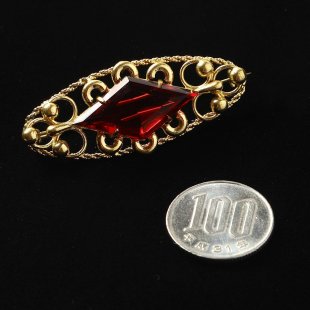 こちらはチェコスロヴァキア時代のヴィンテージ・ブローチ。小さなリングが折り重なって長い楕円形の台座の中央には菱形の赤いカットガラスが配置されています。ゴールドとレッドのカラーコンビネーションが華やかな雰囲気です。1960-70年頃の古いものですが状態も良好です。