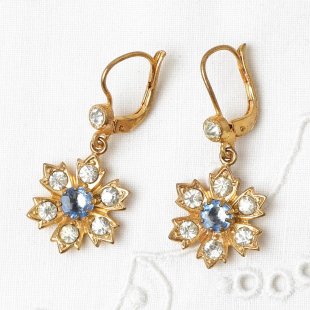 こちらは1920-30年代頃の大変古いヴィンテージピアスです。こちらはデッドストックの未使用品として入荷しました。保存状態が良く金属の劣化のほとんど見られないデッドストックです。薄い金属台座は、そのままお花の形、花びらの上にはカットガラス、雄蕊の中央部分にはクリアブルーのカットガラスがあしらわれています。装飾は繊細で大変美しいものです。ちょっとアールデコなスタイルも感じさせます。さまざまなシーンでお使い頂ける素敵な年代物。(ほとんどアンティークのお名です。)たれの部分がキラキラと揺れ、カットガラスがキラキラと光を放ちます。金属は柔らかいので取り扱いにはご注意くださいませ。