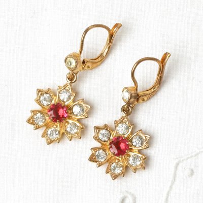 こちらは1920-30年代頃の大変古いヴィンテージピアスです。こちらはデッドストックの未使用品として入荷しました。保存状態が良く金属の劣化のほとんど見られないデッドストックです。薄い金属台座は、そのままお花の形、花びらの上にはカットガラス、雄蕊の中央部分にはレッドのカットガラスがあしらわれています。装飾は繊細で大変美しいものです。ちょっとアールデコなスタイルも感じさせます。さまざまなシーンでお使い頂ける素敵な年代物。(ほとんどアンティークのお名です。)たれの部分がキラキラと揺れ、カットガラスがキラキラと光を放ちます。金属は柔らかいので取り扱いにはご注意くださいませ。