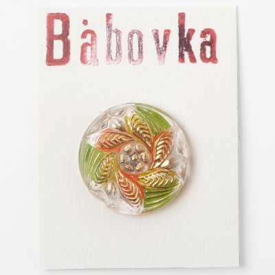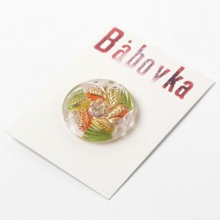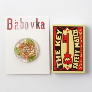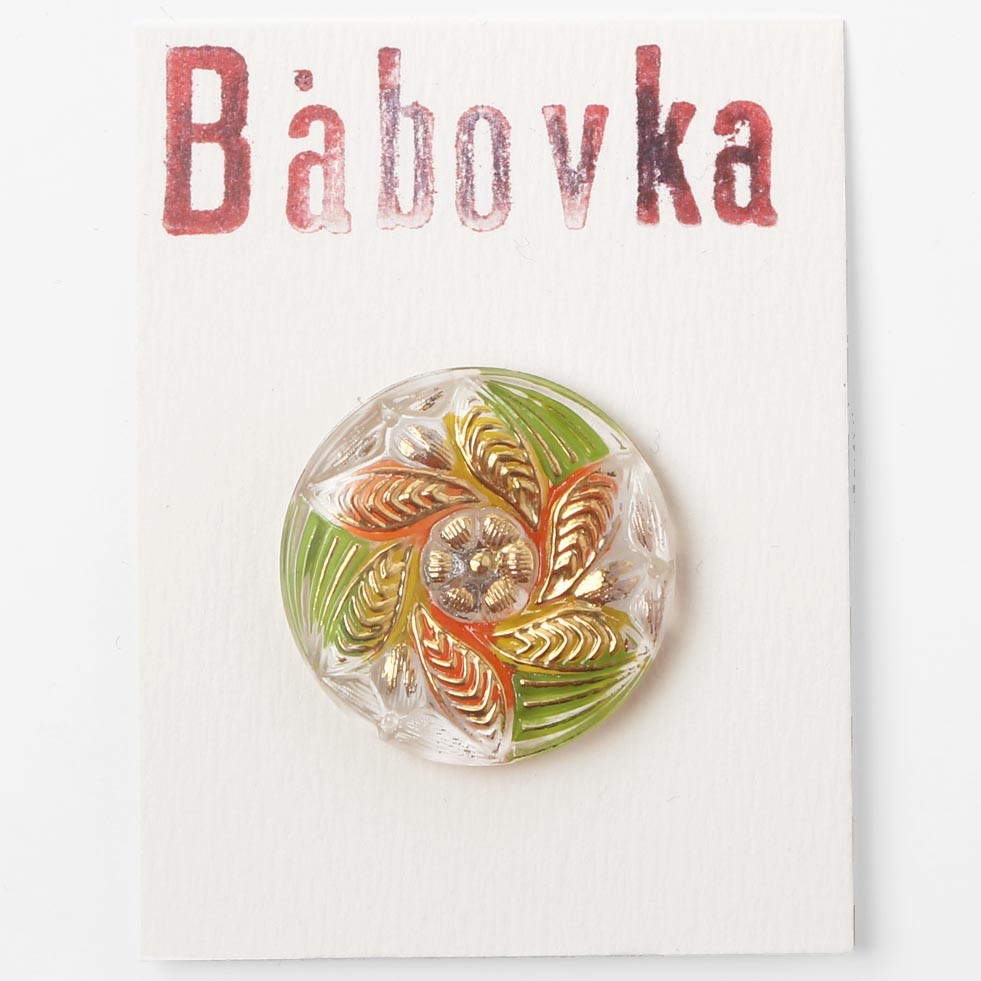 こちらは現行というよりは少し古いガラスボタンです。花ぐるまのデザインでクリアなガラスを使用し、裏からグリーンとオレンジのペイントが施されています。花びらはゴールドのペイントの爽やかでカラフルな仕上がりです。20年ぐらい古いもので、心のこもったペイントの丁寧さを感じます。現行では扱いのないカラーバリエーションです。