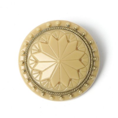 バーボフカが長年コレクションしてきたアンティークのガラスボタンからのお品です。カフェオレ色のガラスを使用したボタンでカルーセル(回転木馬)の屋根を思わせるデザインのガラスボタンです。おっとりとしたアンティークらしい表情がキュートで個性的なお品です。1920年頃のカードに縫いつけてあった100年古いアンティークです。