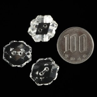 バーボフカが長年コレクションしてきたアンティークのガラスボタンからのお品です。鉛の含有量が多く反射率の高いクリスタルガラスを使用した2穴のボタンです。型打ちではなく、ハンドカットで職人さんの手によって制作されたもので、複雑なお花にょうなフォルムのガラスボタンです。カット面にキラキラと光を反射し、美しい工芸品のようなお品。100年古いアンティーク。チェコからのとっておきです。
