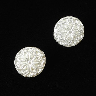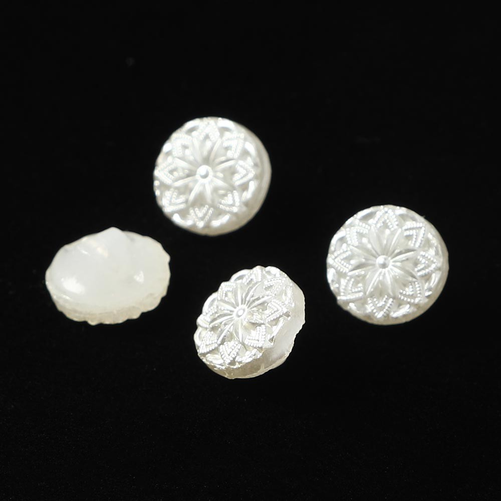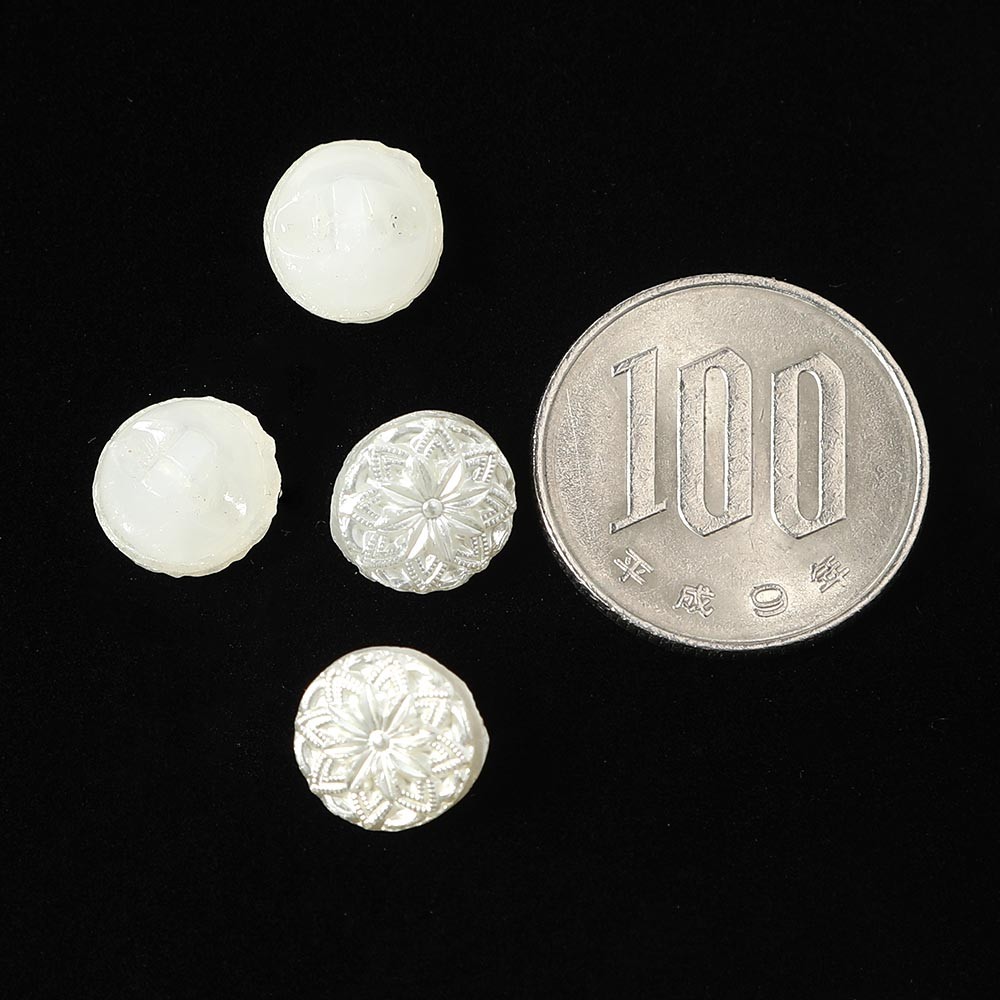 バーボフカが長年コレクションしてきたガラスボタンからのお品です。直径は1cmで小さく、乳白色のガラスを使用したボタンで、表面には大変細かいお花の模様が施されています。表面にはシャイニーホワイトの塗料が塗布されています。塗料は針のような先の鋭いもので強く擦ると剥げてしまい場合がございますので、ご了承の上お求めください。ノスタルジックな雰囲気が愛らしい1950年代前後のオールドヴィンテージです。2個でのご提供です。