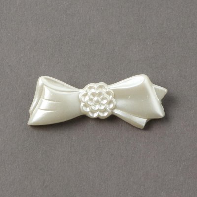 チェコ・ガラスの街ヤブロネツで作られたガラス製ヴィンテージ・ブローチ。デッドストックで入手の未使用品です。1950-60年代のものです。リボンのモチーフで中央にお花のあしらわれたフェミニンなイメージの美しいブローチです。こちらは乳白色のガラス製で表面にはシャンパンホワイトの塗料が塗布されたエレガントな仕上がりです。今では作られていないこのガラスブローチ。コレクターズアイテムとしておすすめです。ピンには一点焼けの入った部分があります。写真でご確認ください。