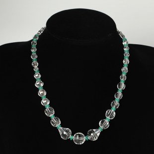 こちらは1920-30年代のヴィンテージ・クリスタルガラス・ネックレス。こちらのクリスタルガラスのビーズはかつて職人さんが一つ一つハンドカットで製作した大変貴重なネックレスです。表面には大変細かな面取りが施され、光をキラキラと反射します。中央の大きなガラスビーズは大きさ約1.3cm、合間にはアクセントでグリーンのビーズも配置された爽やかな雰囲気の一品です。目立ったかけもなく全体の状態は素晴らしいものです。一見すると90年-100年も古いとは思えないとてもモダーンなデザインのネックレスかと思います。チェコのビジュー美術館にも同じようなハンドカットのクリスタルガラスのネックレスが展示されていて、今では入手が難しいとっておきのネックレスです。職人さんの技が光る秀品です。パーツと糸はレストアされていますので、糸切れの心配もございません。