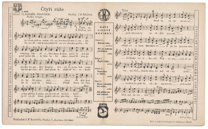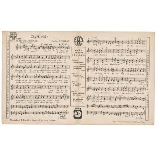 こちらはとても古いチェコの楽譜、1948年の古いものです。例えば居酒屋で演奏していた音楽家などが購入していたとか。「4本のバラ」(仮題)という題名で1943年に作曲されたポルカ音楽です。庭に4本のバラがあって、3本は咲いたが一本は枯れてしまった。」と言うメランコリックな内容の歌詞が書かれています。曲はJ.F.バルガという作曲家が書いたものです。表紙の絵はチェコのグラフィックデザイナーのもので、レトロでチェコらしい素敵なデザインかと思います。経年の風合いがあります。紙は薄いもので繊細なものです。古いものという事をご理解の上ご購入をお願いいたします。